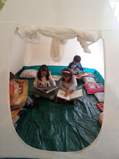 E pronto, combinámos trazer tendas para o jardim de infância. Hoje surgiu uma área sossegada diferente.